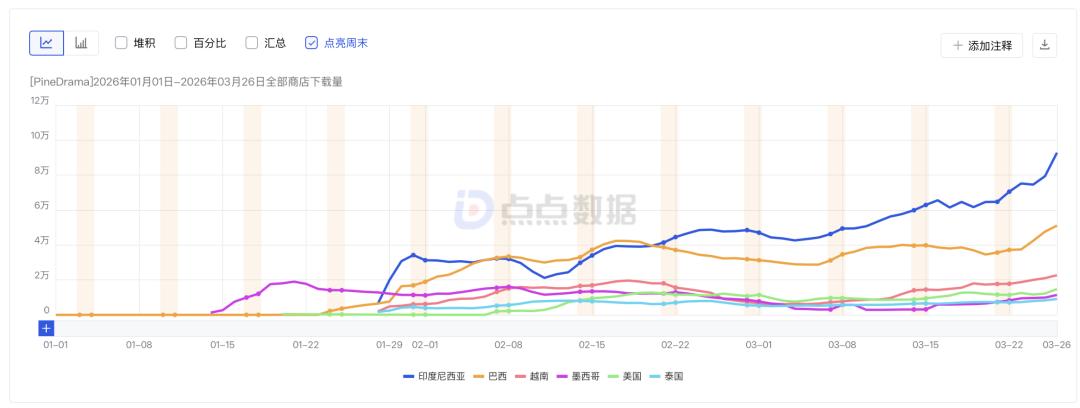 PineDrama主打“全程无广告”,主攻新兴市场。根据点点数据显示,1月1号至3月26号,该APP累计下载量684万次。