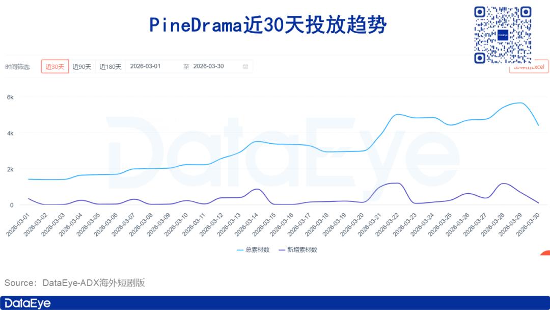 从投放趋势来看, PineDrama自3月初开始加大投放力度,3月初日均投放素材量超2000组,近一周日均投放量已突破4000组,单日最高投放量达5662组。