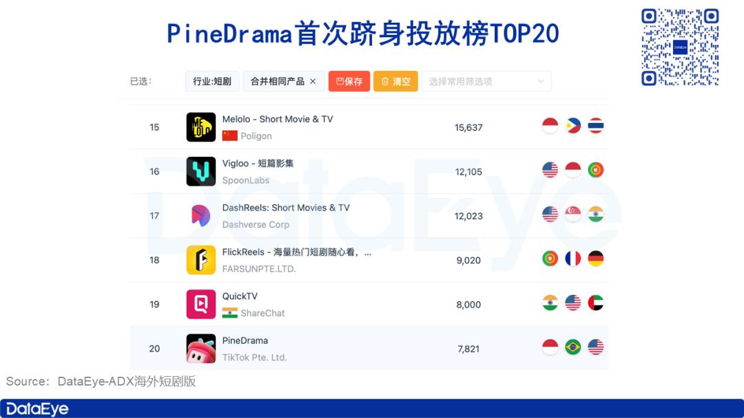 从投放素材量来看,过去一周(3月23日至3月29日),PineDrama投放素材量达7821组,首次跻身ADX海外版短剧APP素材周榜TOP20。