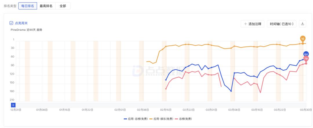 DataEye研究院留意到, TikTok海外微短剧APP PineDrama持续加码买量投流,于3月29号首次登上美国谷歌商店应用·娱乐(免费)榜TOP10,并在30号仍维持这一排名。