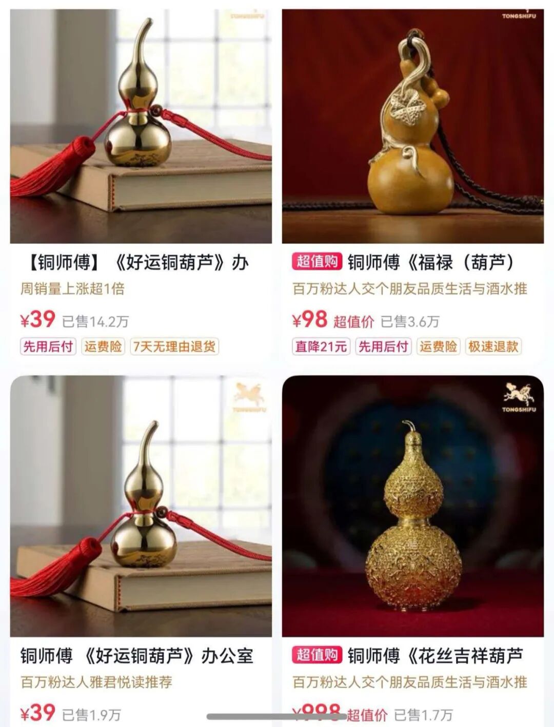 铜师傅主打铜器摆件,SKU 已超 2600 个,价格带从 39 元引流款,到800~1000元的礼赠款,一直延伸到万元级收藏款,同时还拓展了银器、黄金、潮玩等新品类。