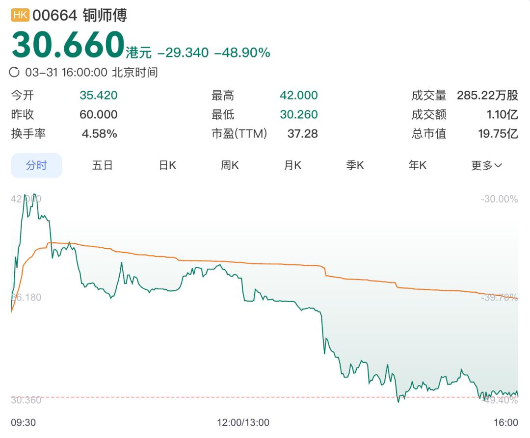 截至收盘,铜师傅股价为30.66港元,较发行价(60港元)大跌48.9%,总市值缩水18.75亿港元。