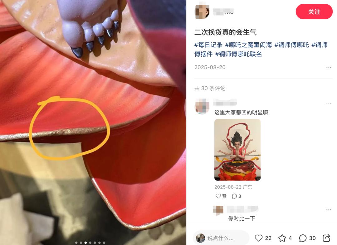 当年轻粉丝满怀期待购入联名摆件后,却发角色面部凹陷、轮廓模糊、细节打磨粗糙,与铜师傅宣传的收藏级工艺相差甚远;引发粉丝大规模抗议的是,创始人相关账号被曝与攻击角色敖丙的黑粉账号互相关联,直播间对粉丝的合理质疑视而不见,事后铜师傅还将正常的品控维权简单归类为 “饭圈行为”,用删评、拉黑、对抗式沟通进一步激化矛盾。