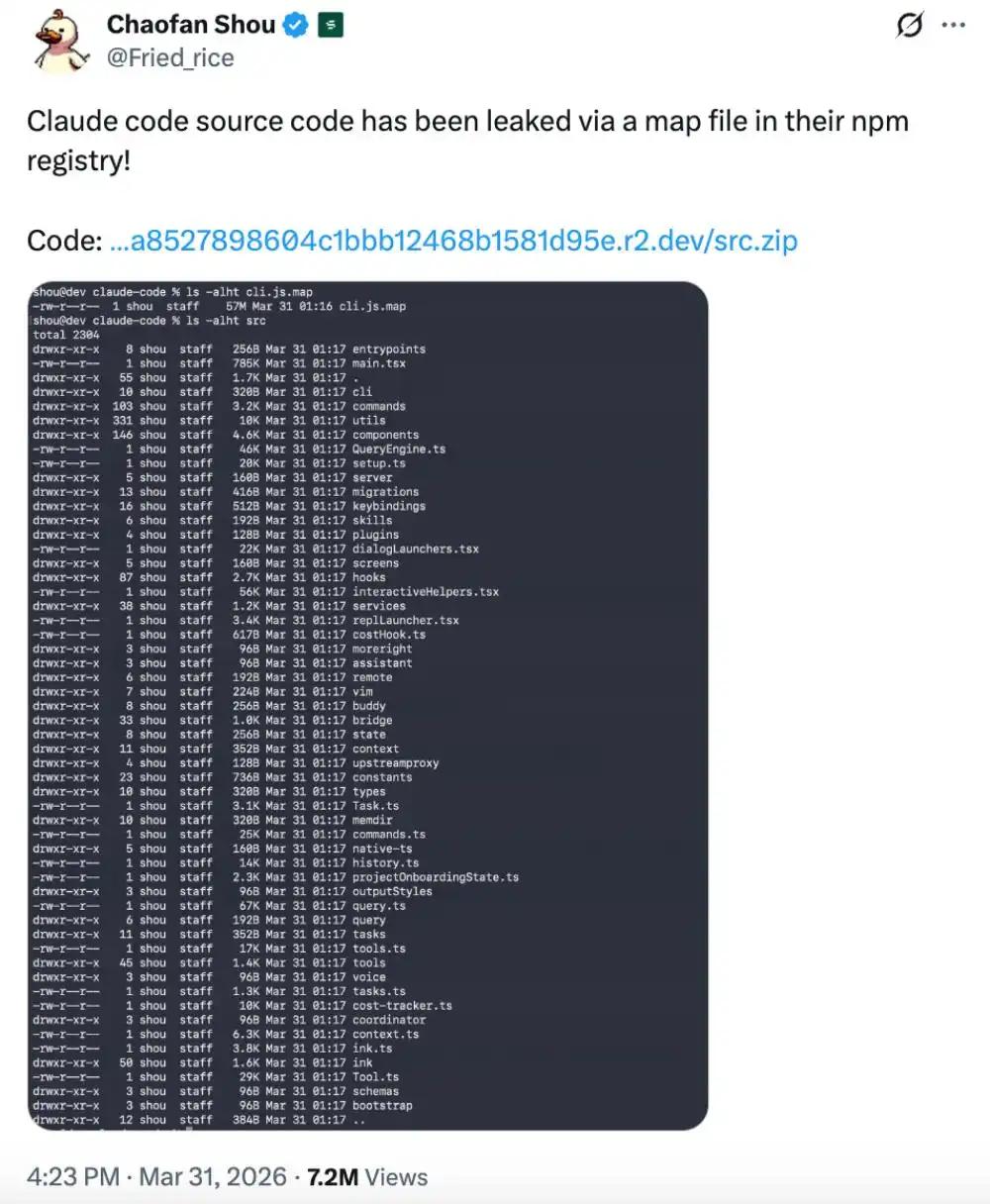 整个过程堪称魔幻现实主义,一位名叫Chaofan Shou的安全研究员在npm包中翻出了一个59.8MB的“cli.js.map”文件,通过它,Claude Code的核心源码,连同开发者手写的注释,瞬间成了全球开发者硬盘里的“公共财产”。