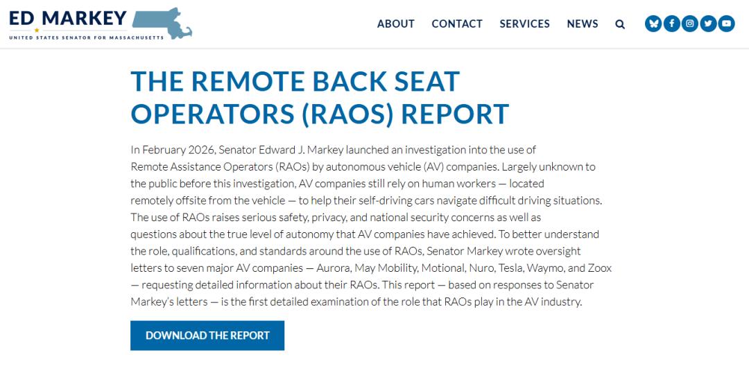 Markey周二批评称,自动驾驶汽车公司长期以来一直吹嘘他们可以消除人为失误造成的道路交通事故,但实际上他们承认其技术仍需要依赖人类的帮助。