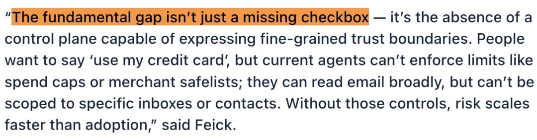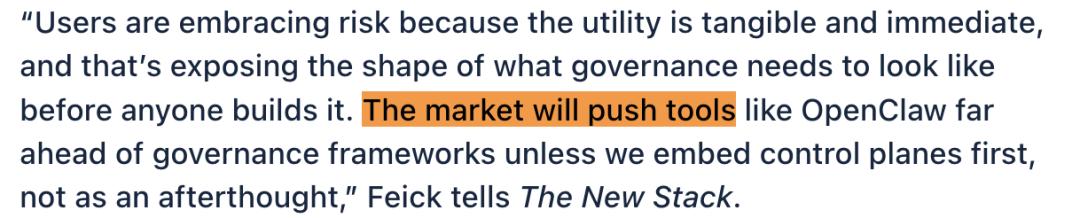 一个月前,Feick警告要把控制平面,嵌入OpenClaw这样的工具,而不是事后补充。