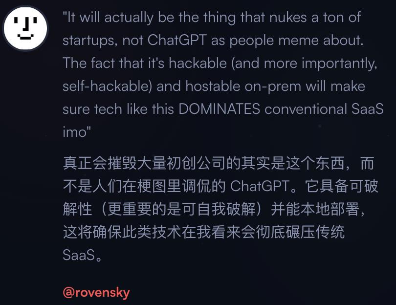 它才是真正会干掉一大批SaaS创业公司的东西:不是ChatGPT。因为它可以被hack,更重要的是可以self-hack,而且可以本地部署。这会碾压传统SaaS。