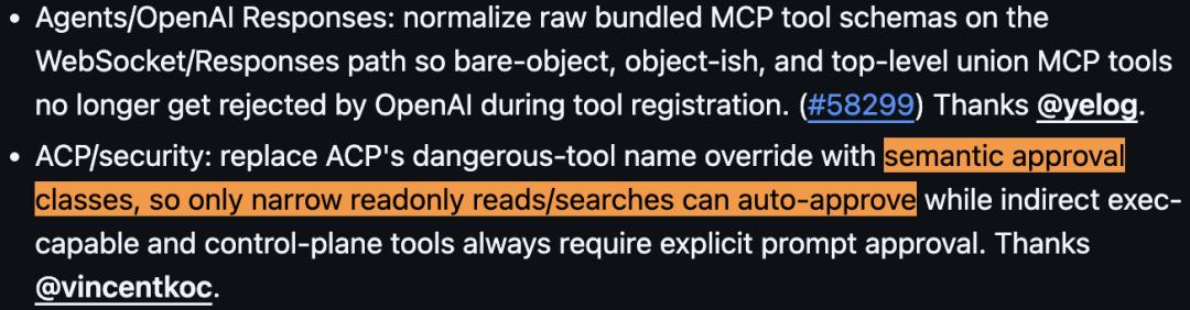 这条改动针对的是ACP审批链路,不是OpenClaw全部审批系统的统一切换,但它封堵了此前最大的一个权限漏洞。