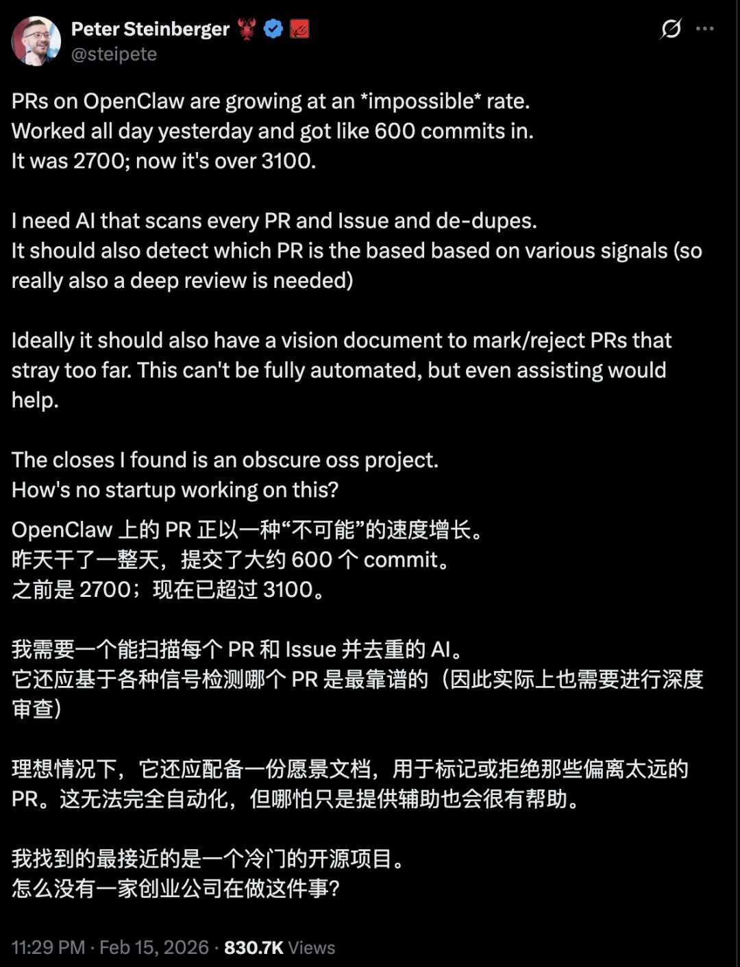 PR以不可能的速度增长:一天曾提交了大约600个commit,因此他需要一个AI来扫描每个PR和Issue并去重。
