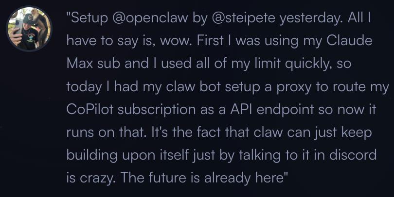 网友jonahships_说:「Claw能不断在自身之上构建新能力,你只需要在Discord里跟它说话就行。未来已经到了。」