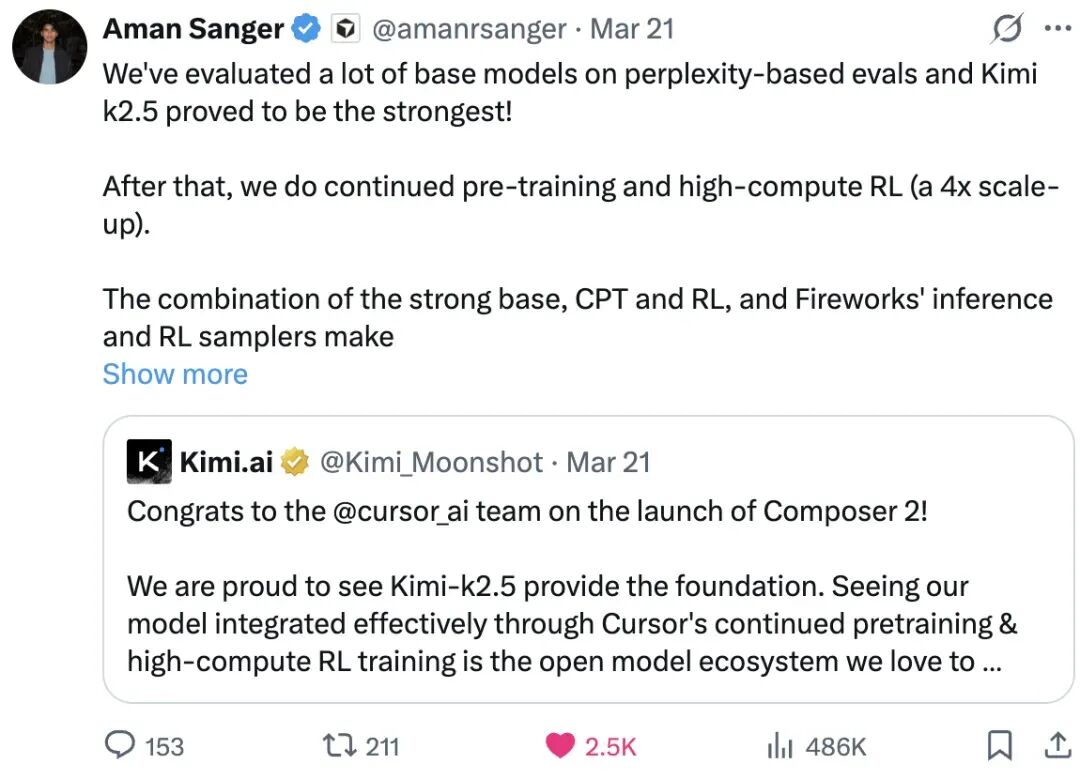 Cursor 创始人公开致歉并承认 Kimi K2.5 是其测评中「最强的基座模型(Strongest base model)」,是其核心产品的灵魂。