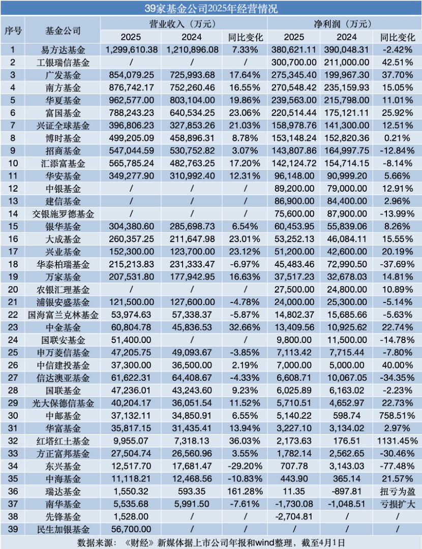 据《财经》新媒体不完全统计,截至4月1日,至少有39家基金公司(不含券商资管)2025年经营数据出炉。