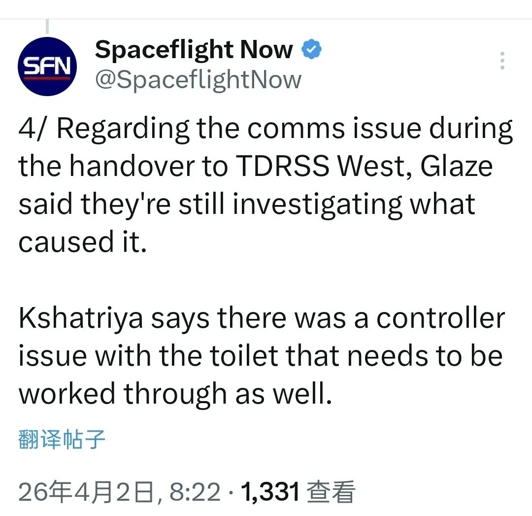 不过,猎户座飞船升空约 51 分钟后,厕所系统出现了控制故障告警持续闪烁,NASA地面团队正在排查;最坏情况下,宇航员可以退回到应急收集袋方案。