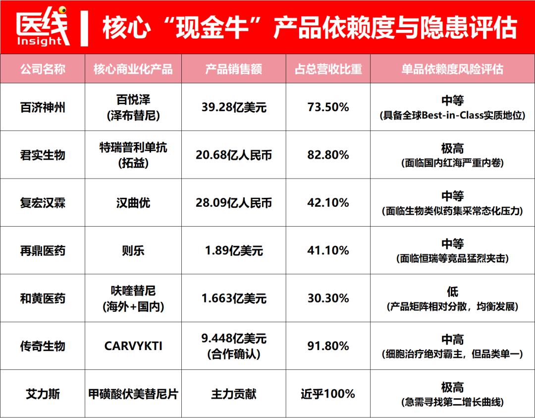 不过,与百济、传奇依靠全球市场大杀四方不同,国内部分药企在交出亮眼财报的背后,隐藏着结构性风险——“单品依赖症”。