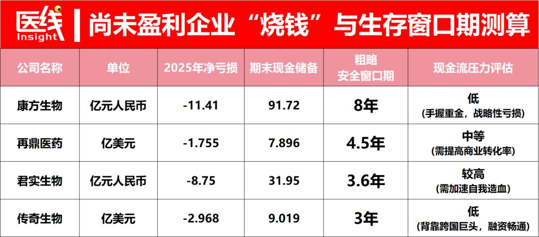 作为License-in模式鼻祖的再鼎医药,2025年净亏损1.75亿美元,期末现金7.9亿美元,其安全生存窗口期约为4.5年。