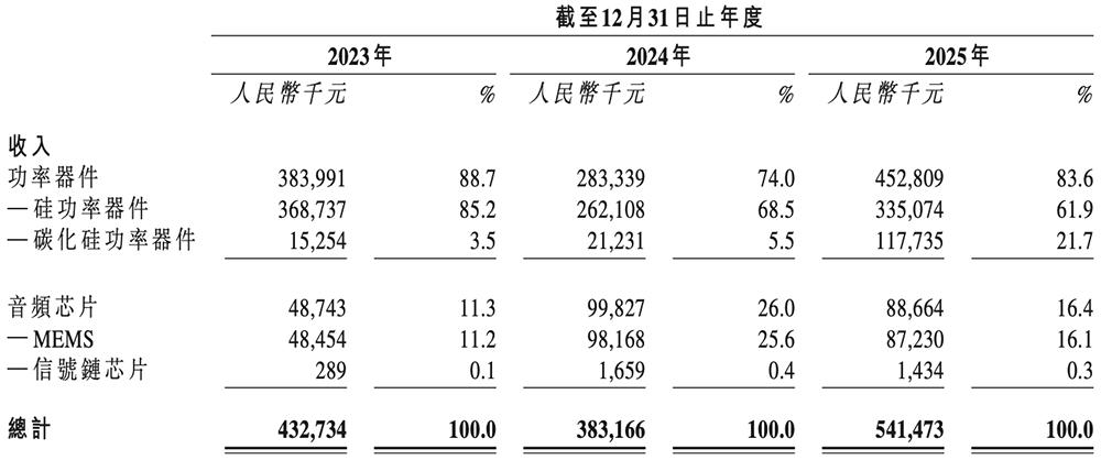 其收入主要来自设计、开发及销售功率器件(包括硅及碳化硅功率器件)、音频芯片(包括MEMS产品和信号链芯片),其中功率器件收入占比超过74%。