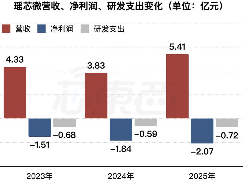 2023年、2024年、2025年,瑶芯微收入分别为4.33亿元、3.83亿元、5.41亿元,净亏损分别为1.51亿元、1.84亿元、2.07亿元,研发费用分别为0.68亿元、0.59亿元、0.72亿元。
