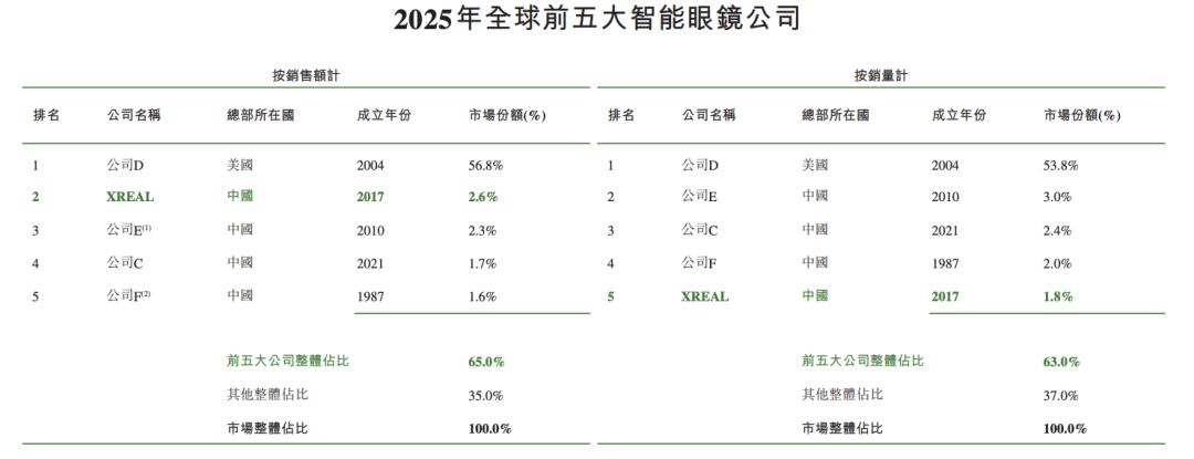 根据艾瑞咨询(iResearch)的数据,XREAL 在 2022 到 2025 年连续四年拿下全球 AR 眼镜市场销售收入第一;只看 2025 年,它的收入市占率达到 27.0%,销量市占率 24.8%,在更广义的智能眼镜市场里也做到了全球第二、中国第一。