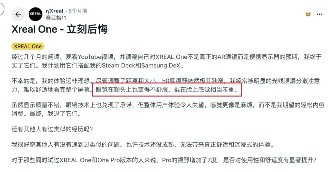 在 XREAL 主销的海外市场,就有不少用户反馈 XREAL 的产品在佩戴超过 1 小时之后,就会出现鼻子、耳朵发酸的问题。