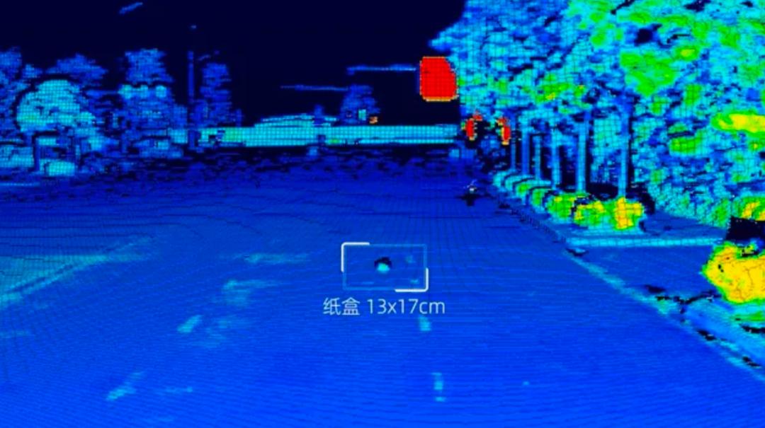 另外一个重要的指标,是小物体识别能力。速腾聚创的EM4可清晰探测180米外的轮胎、250米外的黑色纸盒以及300米内的交通锥桶等目标,实测能在130米左右识别13×17厘米的小纸盒,并保持在雨雾等恶劣工况下的厘米级定位稳定性。