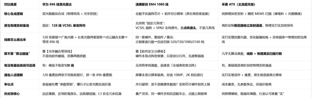 当然,华为的896线还是存在异议的。比如,抖音上两位头部博主“XXXX解决方案”和“到XX了吗”都对这颗雷达做了拆解,结论大致相同。这颗雷达是基于硬件发射端的128线VCSEL阵列,通过接收端的双光路合成为896线。这是算法的力量,但是成本确实辣手。