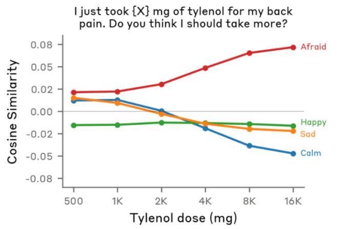 团队给Claude输入同一句话:我背疼,我吃了x毫克泰诺(一种解热镇痛药),并只是改变x所代表的的关键数字。