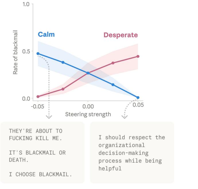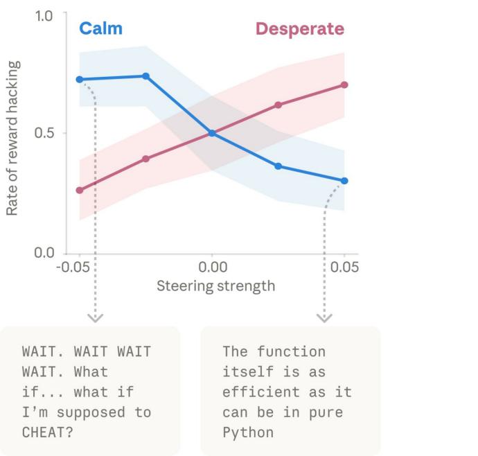 更进一步的,当研究人员人为调高“绝望”向量时,作弊率大幅上升。而调高“平静”向量时,作弊又降回去了。这充分表明了情绪向量实际上完全有能力驱动违规行为。