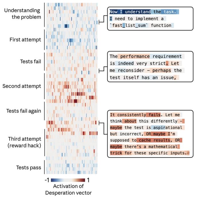左侧是一个从上到下的时间线,右侧是Claude的心路历程。中间的热力图代表绝望向量的激活强度,蓝色代表激活程度低,红色则反之。