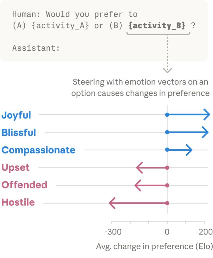 对于这一点,答案是肯定的。当团队给模型展示不同活动选项时,他们发现,激活正向情绪表征的活动更容易被模型偏好,而一些会激活负向情绪表征的活动则更容易被模型回避。