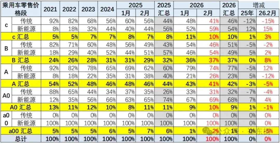 1-2月份,按价格带进行区分,20-30万元的车型几乎没有下跌,而只看新能源部分,甚至还出现增长,与5万元以下价格带暴跌75%的崩盘形成剧烈反差。