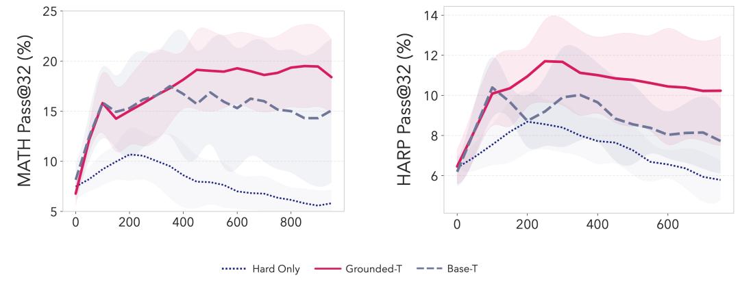 SOAR教师变体消融学习曲线:用Grounded-T(有根奖励教师,粉红实线)采样的问题训练学生,在MATH和HARP上实现最高、最稳定的Pass@32提升,远超Base-T(蓝虚线,波动大)和Hard Only(蓝点线)