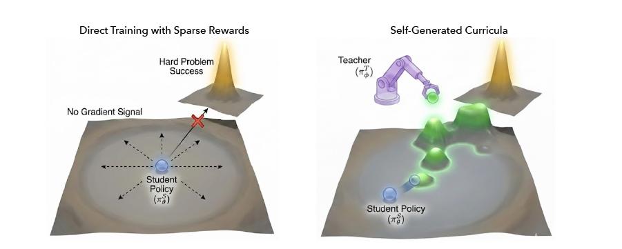 直接训练 vs 自生成课程:左侧稀疏奖励导致无梯度信号;右侧教师模型生成中间难度问题,形成渐进式课程,帮助学生模型在Fail@128数据集上实现突破