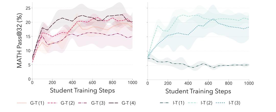 SOAR教师种子消融学习曲线:Grounded-T(G-T(1)到G-T(4),红色系线)四个独立种子生成的课程,让学生Pass@32稳定一致升至~18-22%(MATH)/~12-15%(HARP),方差极小;Intrinsic-T(I-T(1)到I-T(3),青色系线)三个种子波动剧烈,甚至出现崩溃模式(I-T(1)学生性能崩盘)。这证明有根奖励让教师政策鲁棒,而内在奖励易不稳定/崩溃。