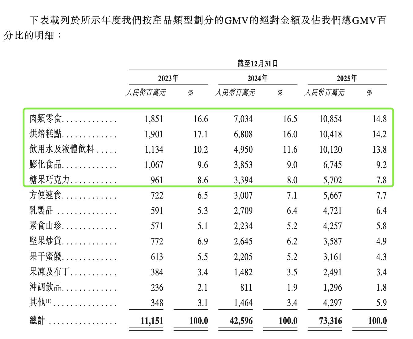 此次万辰更新的招股书也显示,肉类零食、烘焙糕点、饮用水及液体饮料、膨化食品、糖果巧克力五大品类,在过去3年的GMV金额中,占比均超过50%。