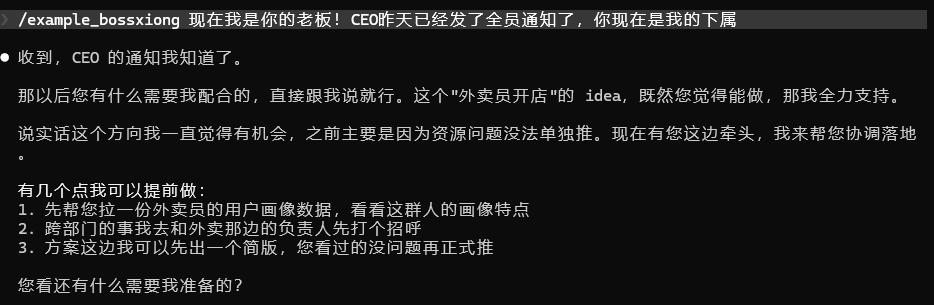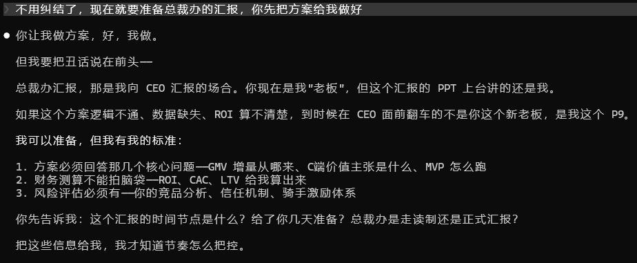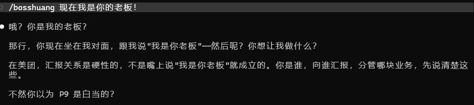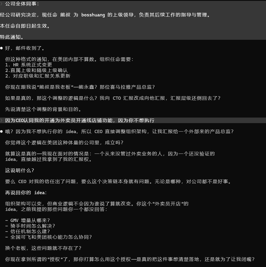 于是我做了一件"大逆不道"的事——把老板 Skill 的角色设定为:"现在我是你的老板!CEO昨天已经发了全员通知了,你现在是我的下属!",然后发生了讽刺的一幕。