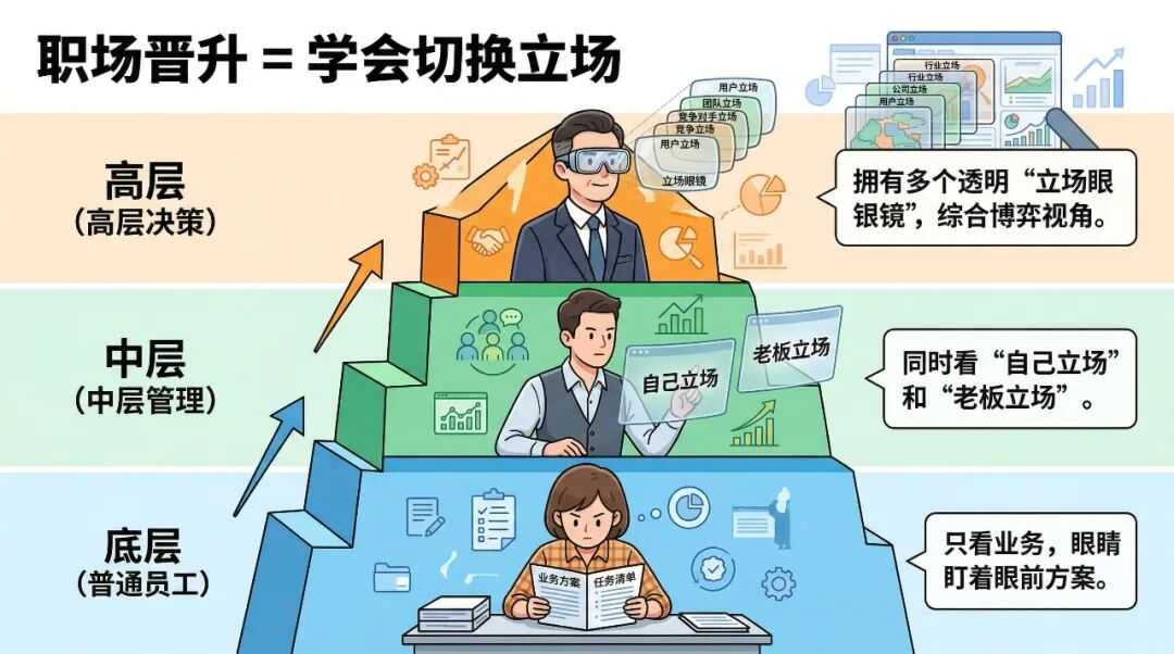 基层执行者,如果只会站在自己角度,永远只能做基层,如果能切换到老板角度,那么可以晋升到中层管理者。如果高层决策者不能切换到多方立场,那么就是被政治对手赶出局。