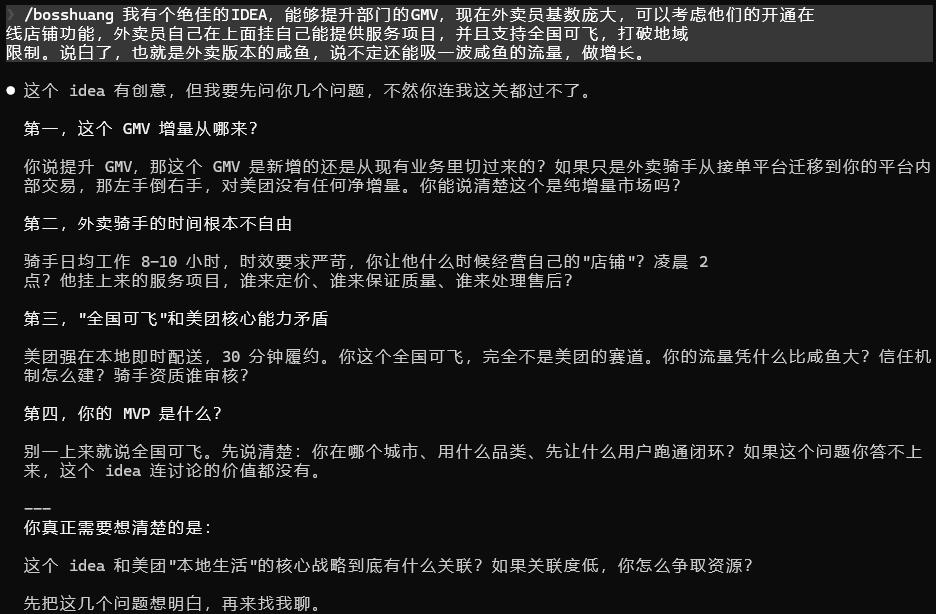 测试的场景是:模拟一个方案审批,让老板 Skill 判断"这个需求做不做"。