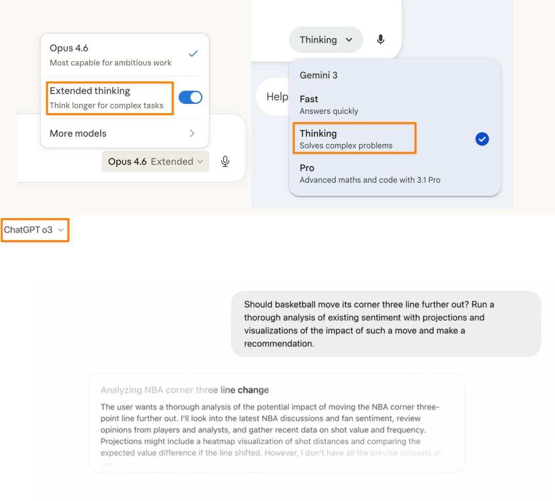再比如让模型回答之前推理一会再给你答案,Anthropic 叫 extended thinking,Google 叫 thinking,OpenAI 在 GPT-5 之前甚至还包装成了一条独立模型产品线,叫 o 系列。