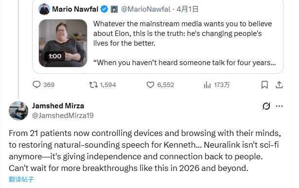 另一位网友则把重点放在了肖克这个具体案例上。他说,从21位患者如今能够用意念控制设备和浏览网页,到帮助肖克恢复自然流畅的语言表达,Neuralink不再是科幻小说里的情节——它正在帮助人们重获独立和人际交往的能力,期待在2026年及以后看到更多类似的突破。