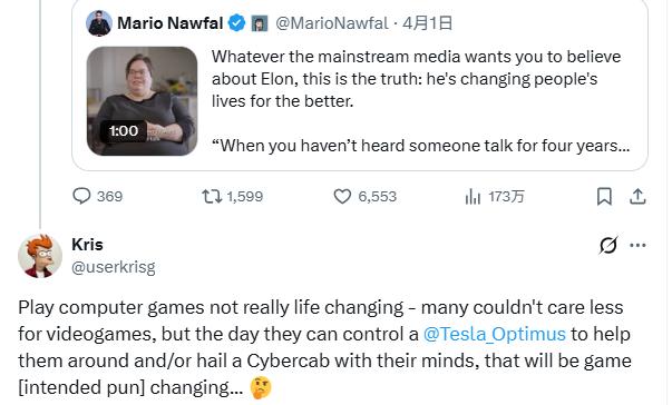 也有网友提出了更具体的应用场景。有人认为,玩电脑游戏并不会真正改变人生——许多人对电子游戏漠不关心,但当他们能够控制一个特斯拉Optimus机器人来帮助他们四处走动,或者用意念召唤一辆网约车时,那将会彻底改变游戏规则。
