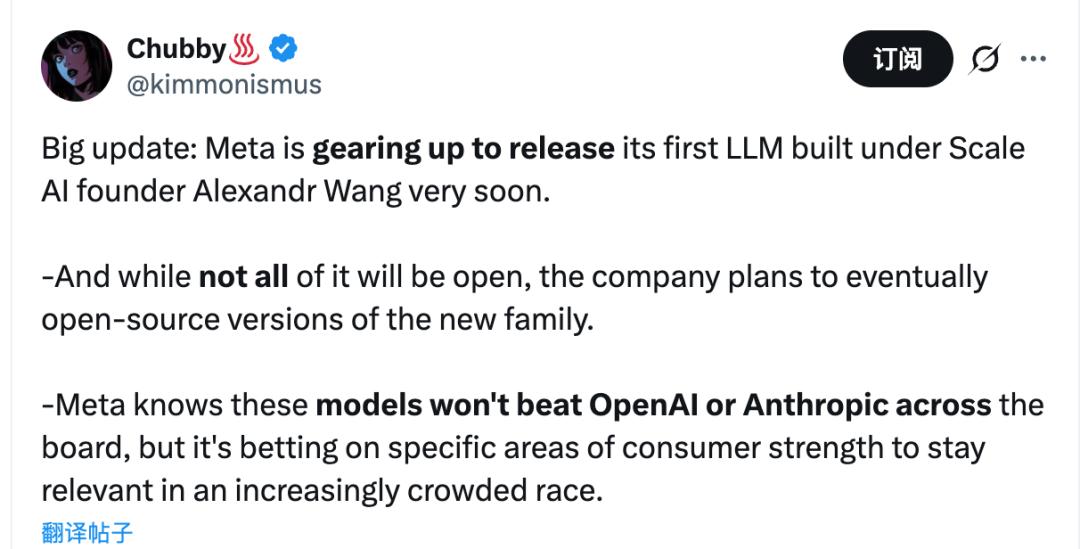 不过,亚历山大王这每天两万亿也没白烧,Meta第一个由他主导的模型,即将以“半开源”的形式揭晓。