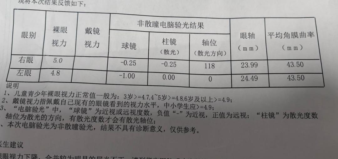 视力筛查单显示,小宇的裸眼视力降至0.8,眼轴24.49mm,老师提醒需及时干预。