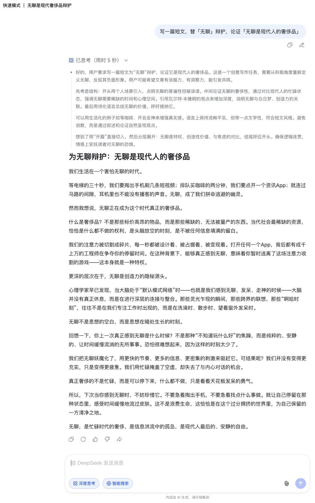 创意写作方面,我给两种模式出了一道辩论写作题,题目是「替无聊辩护,论证无聊是现代人的奢侈品」。