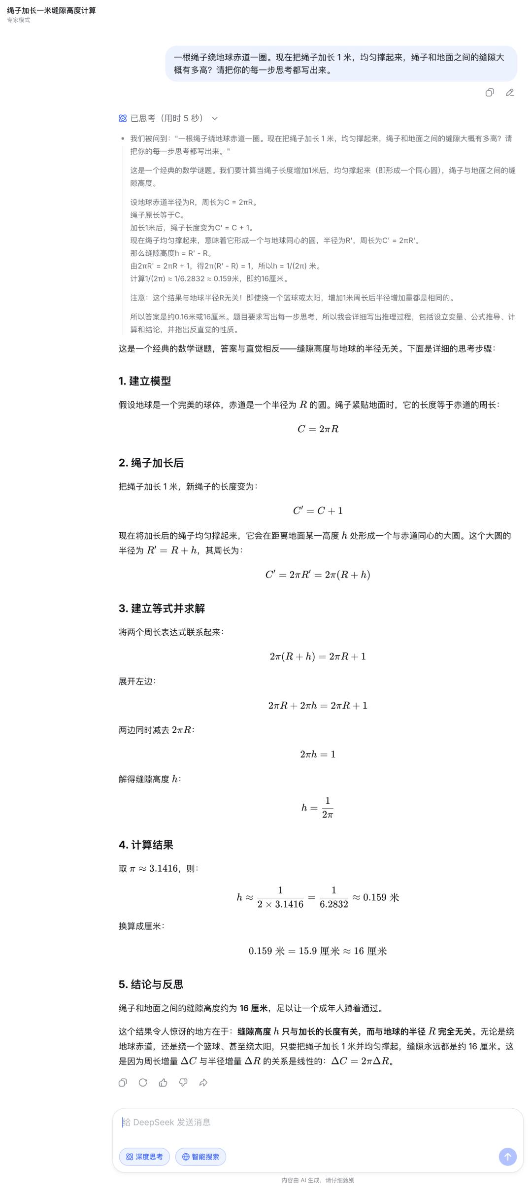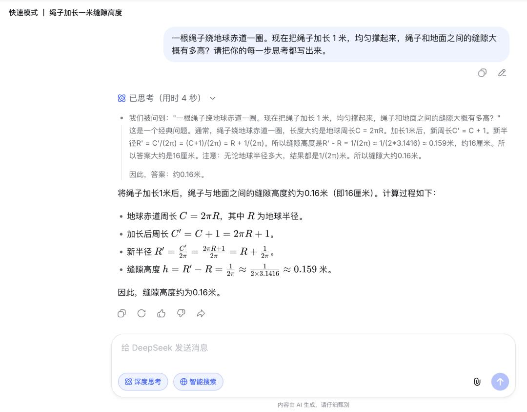 在数学逻辑题「绳子绕地球一圈,加长 1 米均匀撑开,缝隙多高?」中,尽管两个模式给出了相同的答案,但过程截然不同。快速模式的回答很简略;专家模式则一步一步拆解,每个推导环节都交代清楚,更接近「把思考过程写出来」这个指令要求。