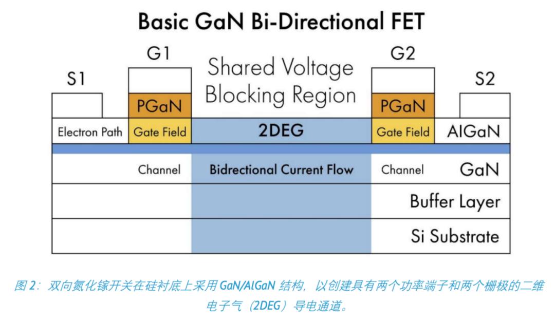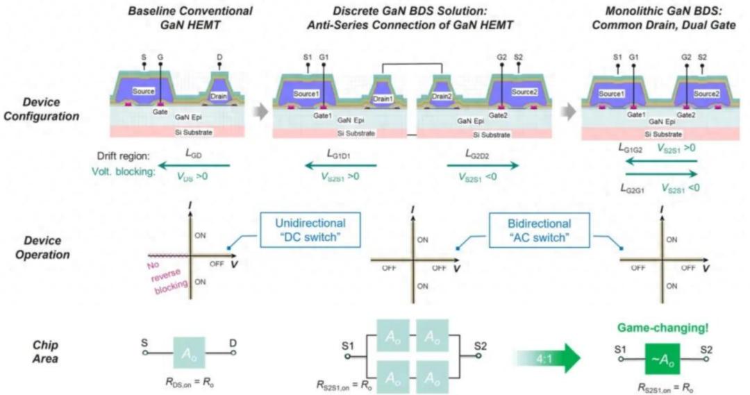 GaN BDS的概念源于将两个背靠背的单向GaN HEMT进行单片集成,两只单向GaN HEMT在共漏极结构中的单片集成,其中每个HEMT的反向漂移区被合并为一个整体。