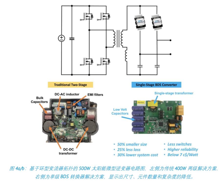 以传统400W两级拓扑太阳能微型逆变器为例,相比某领先制造商采用单级双向氮化镓开关的方案:在功率提升至500W的同时,体积显著缩小,省去1个磁性元件并减少整体元件数量,系统效率从96%提升至97.5%,发电成本从0.10美元/瓦降至0.07美元/瓦,降幅达30%。