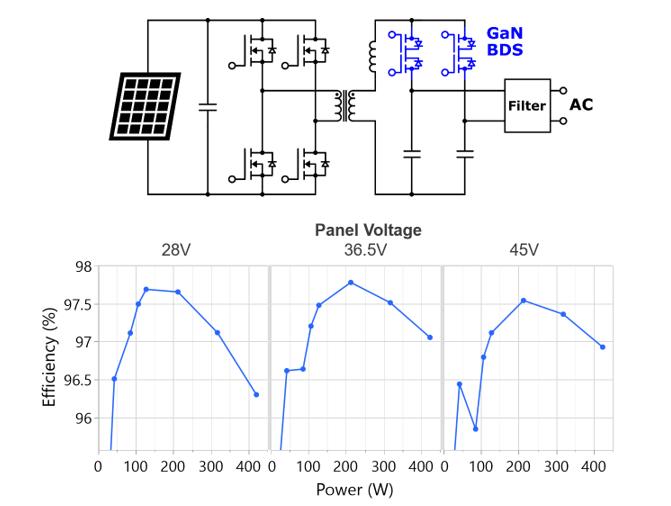 TP65B110HRU 650V、110mΩ高电压GaNBDS可在单个器件中同时阻断正向和反向电流,与传统单向硅基或碳化硅开关相比,能够以更少的元器件实现更高效率的单级功率转换。该器件减少了开关数量并省去了太阳能微型逆变器中的中间直流母线电容,根据美国加州能源委员会(CEC)标准,其功率转换效率可达97.5%以上。