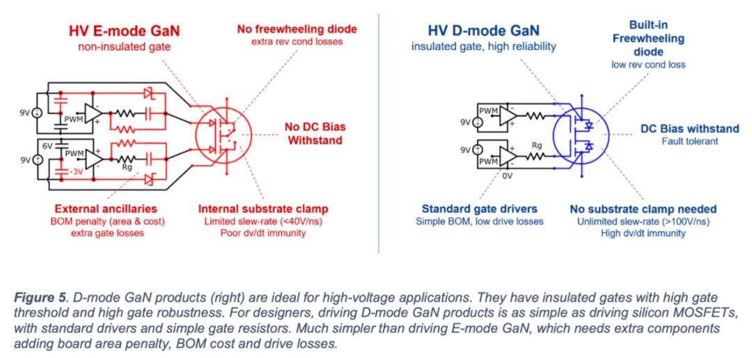 瑞萨特别强调这款产品在D-mode上的优势,其表示对于设计人员来说,只要使用标准驱动器和简单的栅极电阻,驱动D-mode氮化镓器件就和驱动硅基MOSFET一样简单。 这与E-mode氮化镓形成鲜明对比——后者需要额外元器件,不仅占用更多电路板空间,还会增加物料清单(BOM)成本和驱动损耗。