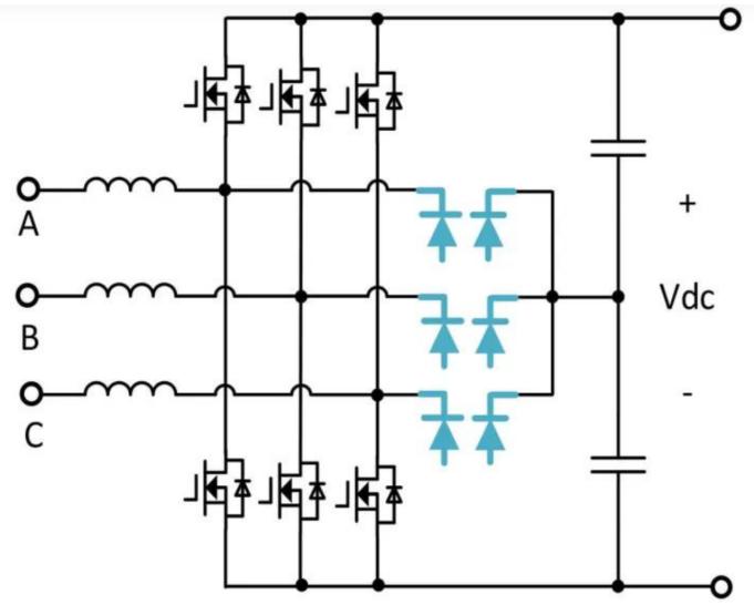 三相三电平T型变换器的拓扑结构,其中GaN BDS作为T支路的中性点开关使用,在双极性条件下仅需承受直流输出电压的一半