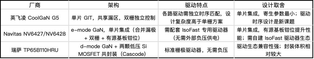 当前,由于三个厂商选择不同技术路线,因此GaN BDS形成了三条不同的路线,各有各的优势。引用“三代半食堂”一句话:“三条路线没有绝对优劣,各自在解决同一个问题(单器件双向阻断),但工程权衡不同。选单片还是 Cascode,取决于你的系统封装约束、驱动器生态和控制复杂度容忍度。“技术路线对比如下:
